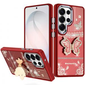 Samsung s26 Ultra Splendid Glitter Butterfly Design Stand with Metallic Edges Hybrid Case – Red